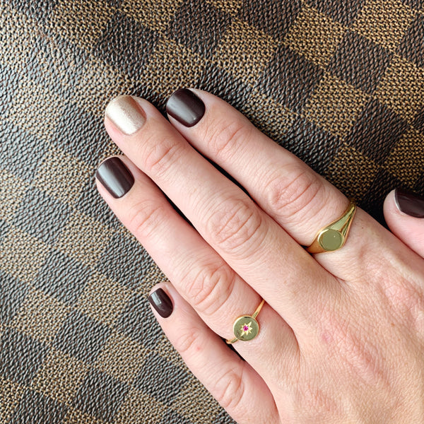 Sterling silver, dipped in gold and polished to perfection! Our Starburst ring shines with a red center stone set amongst a star.