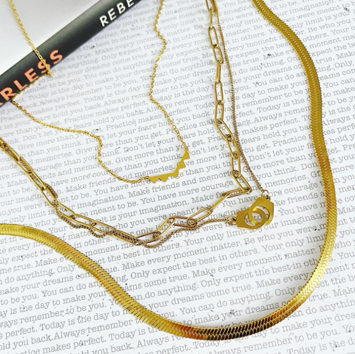 This is an image of our herringbone chain necklace layered with our dainty triangle and handcuff neckalces
